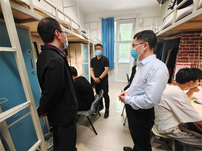 在学生公寓,学校领导查看了学生宿舍门禁系统、线上教学等情况,看望慰问部分学生,叮嘱他们要严格遵守学校防疫规定,争取共同早日战胜疫情,并勉励同学们努力学习知识,积极进取报效国家。