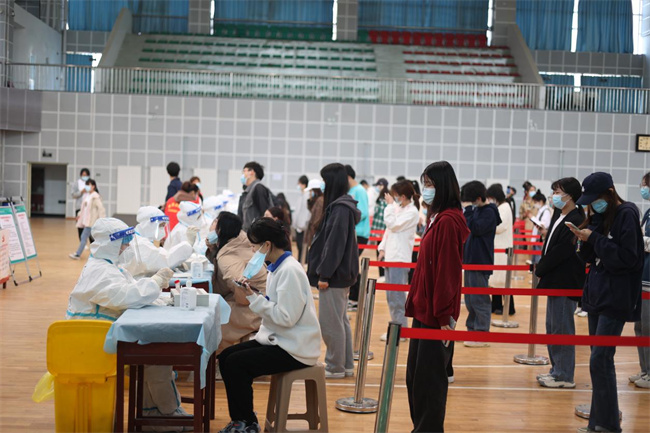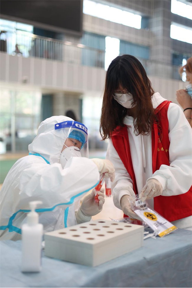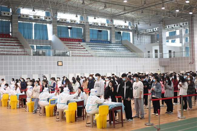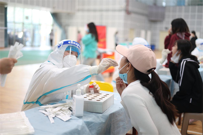 “别紧张”“嘴巴张大一点”“头再抬一些”“马上就好”.....这是身着防护服的医护人员在郑州财税金融职业学院核酸采样点进行核酸检测的场景,一句句如妈妈般温柔的声音让学院几千名被封控在校园的学生们不安的情绪得到安慰。