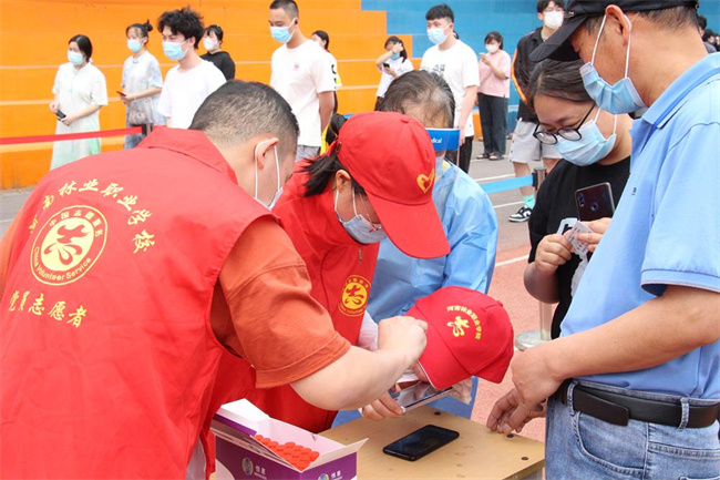 “请同学们排好队,注意间距,依次检测!”“请大家提前准备好身份证,感谢配合我们的工作!”“请大家戴好口罩,做好个人防护!”在河南林业职业学院操场的核酸检测场地,志愿者们在不停地向大家提醒,有的在出入口提醒大家按序排队,有的在现场维护秩序,有的在协助扫码登记……在校园最需要的时候,在需要的地方,就一定能看到身穿红马甲的党员志愿者身影。