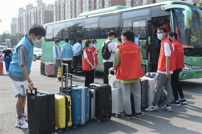 送站现场,离校学生完成离校信息填报后,在学生志愿者的指引下,来到早已等候的送站大巴前,扫描健康码,经体温检测、核酸证明和离校证明等查验无异常后,被送站志愿者护送到车上,安心舒适地踏上返乡之旅。