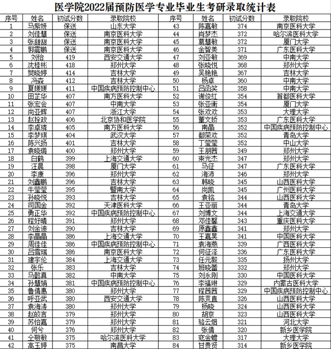 辛勤耕耘育桃李,累累硕果写春秋。河南中医药大学医学院2022届预防医学专业学生取得的喜人成绩,是同学们发奋苦读、踏实努力、辛勤付出的收获,也是医学院长期以来狠抓学风建设、强化“三全育人”、重视人才培养的结果。医学院将进一步落实立德树人根本任务,不断创新工作思路,为学生成长成才、实现青春梦想提供坚实保障。(孙慧娟)