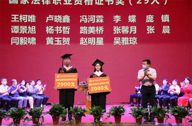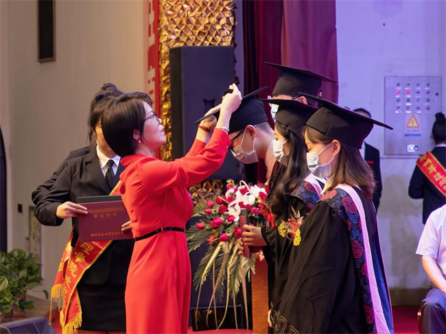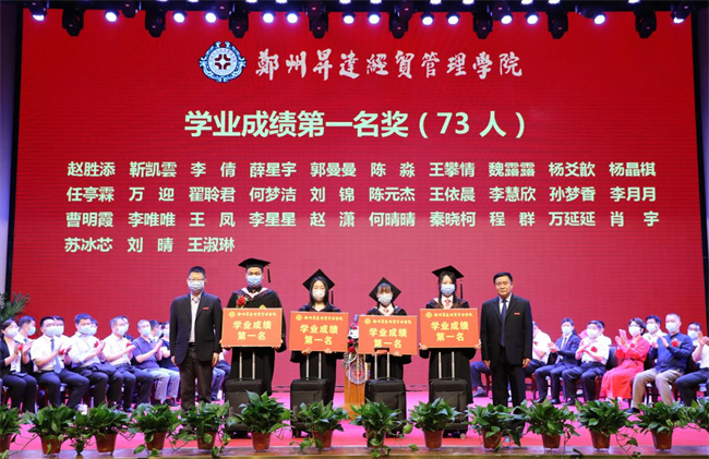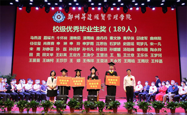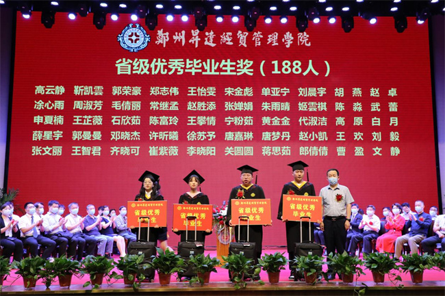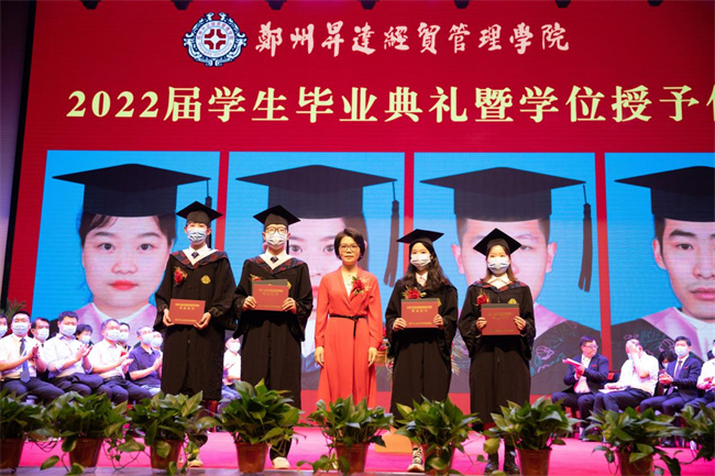 吴益民宣读了《郑州升达经贸管理学院学位委员会关于授予2022届普通本科毕业生学士学位的决定》和《郑州升达经贸管理学院关于表彰710名2022届毕业生的决定》。校长张欣为毕业生代表颁发毕业证书、学士学位证书并扶正流苏。嘉宾、校领导为学业成绩第一名代表,省、校级优秀毕业生和考取各类证照的优秀毕业生代表,资深荣誉教授,优秀毕业班辅导员,捐资助学贡献奖代表等颁奖。