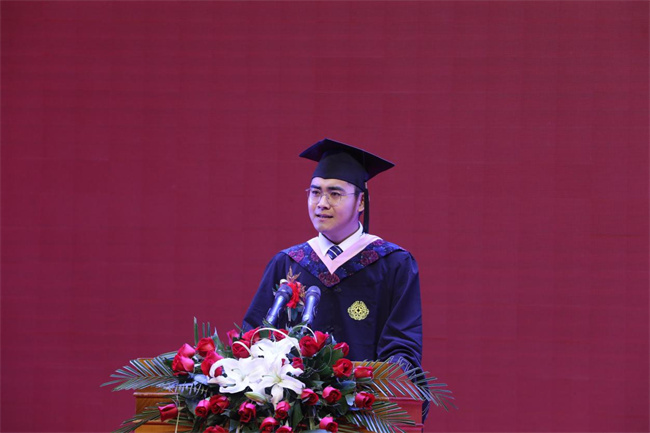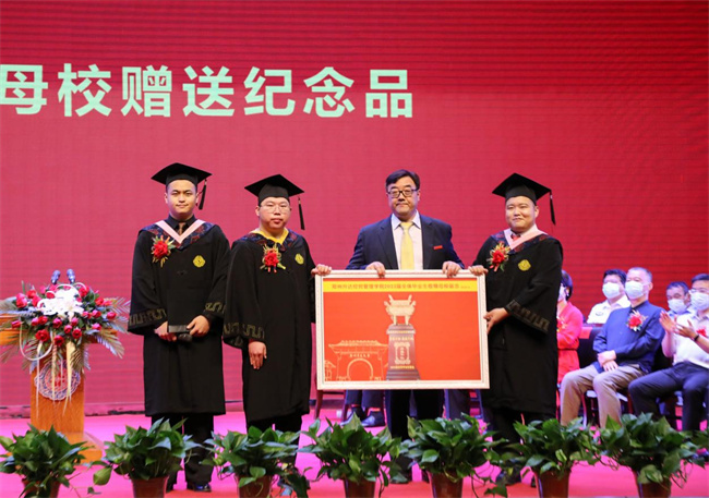 会计学院2018级学生邱林洲代表2022届毕业生发言,回顾校园美好生活的点点滴滴,感恩创办人王广亚博士、母校和恩师的培养教育,他呼吁升达学子努力奋斗与伟大祖国共同成长,在新的岗位上认认真真做事,踏踏实实做人,努力展示升达人的形象与风采!为感谢母校的培育之恩,杨润植、马壮、赵胜天同学代表毕业生上台赠送纪念品方鼎一尊,以寄托近万名学子对母校的惜别深情。