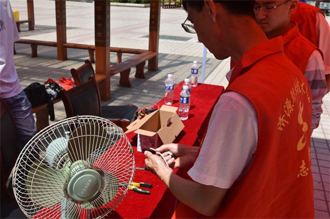 上午9点,济源职业技术学院的柴永森、张新军、赵亚飞、苗辉四位老师,带领“青春红马甲”志愿服务队6名同学到济水苑小区广场。随着小区物业管理员和志愿者的宣传,不久,小区居民带着有故障的电风扇、微波炉等家用电器陆续来到活动现场。张新军老师带领志愿者认真检查每一件电器存在的问题,一丝不苟地维修故障、排除隐患,对无法修复的电器,详细说明原因。赵亚飞老师耐心地倾听居民的咨询,为大家讲解“家庭安全用电常识”和“省电小窍门”,并向居民发放了“家庭安全用电”宣传单。柴永森老师带领志愿服务队的学生上门为居民维修,热情细致的服务,得到居民的连连好评。