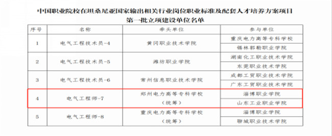 近日,中非职业教育联盟公布了中国职业院校在坦桑尼亚国家输出相关行业岗位职业标准及配套人才培养方案项目第一批立项建设单位评审结果。郑州电力高等专科学校电气工程师岗位标准及配套人才培养方案成功入选第一批立项建设单位名单。