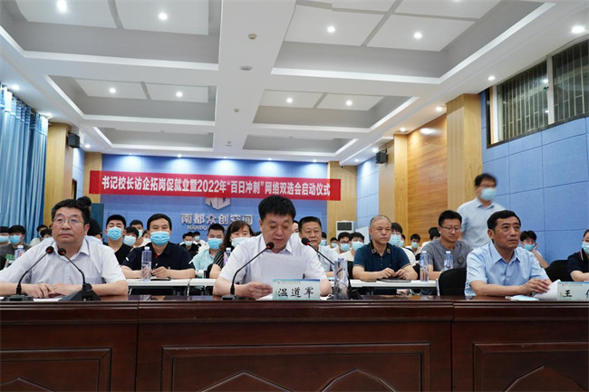 为深入贯彻党中央、国务院关于“稳就业、保就业”的决策部署,积极落实“书记校长访企拓岗促就业专项行动”要求,6月10日上午,河南工业职业技术学院在招就处多功能会议室T1126举行书记校长访企拓岗促就业暨2022年“百日冲刺”网络双选会启动仪式。学校党委书记温道军、校长王伟、副校长王仁伟出席,招生就业处、各二级学院就业工作相关部门负责同志及毕业生代表参加了本次宣讲会活动。活动由王仁伟主持。