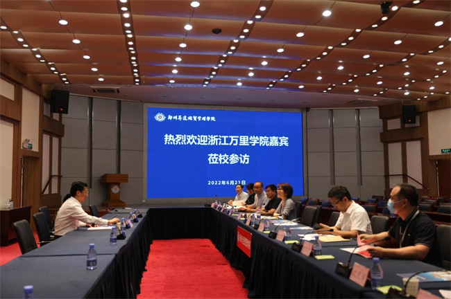 6月21日,浙江万里学院原副校长闫国庆,浙江宁波理工学院教授荆娴等莅临郑州升达经贸管理学院参访交流,交流座谈会在校国际会议厅举行。学校执行董事王新奇,校长张欣,副校长兼工会主席张金安,副校长兼教务长吴益民,董事会办公室、教务处、校长办公室、质量监测与评估中心、人事处、发展规划处、国际交流处、会计学院等相关部门负责人参加座谈。会议由张欣主持。