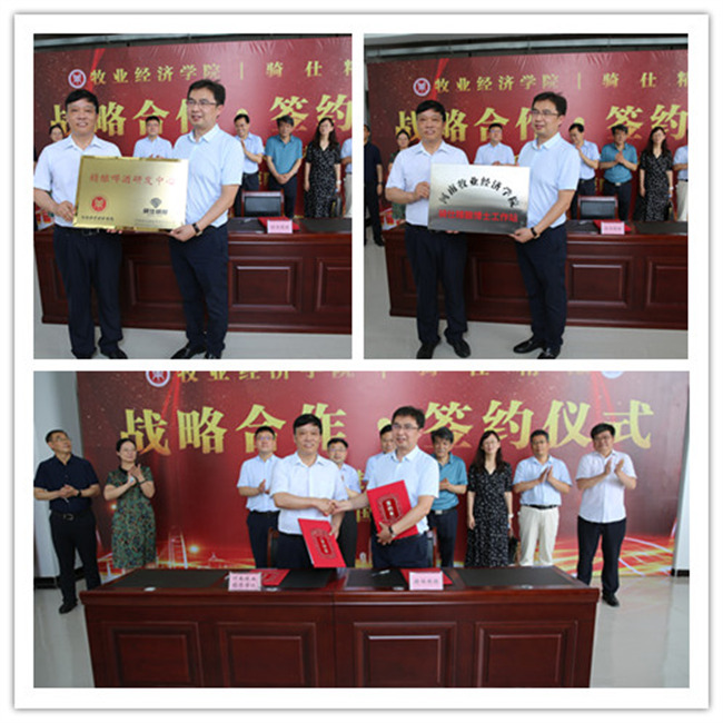 杨宝进与杨俊涛代表校地双方签署了共建“乡村振兴服务中心”合作协议,杨宝进与河南骑仕精酿啤酒有限公司董事长刘元昌代表校企双方签署战略合作协议,并为公司授予“河南牧业经济学院精酿啤酒研发中心”和“河南牧业经济学院博士工作站”牌匾。