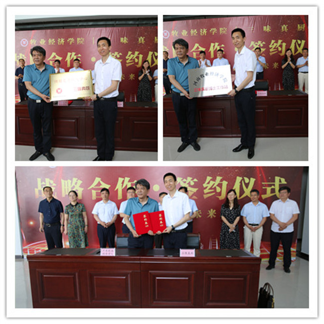 杨国宇与河南三味真厨食品有限公司总经理刘瑞峰代表校企双方签署“预制菜肴品质提升、新产品开发及新型加工技术研究”合作协议,并为公司授予“河南牧业经济学院预制菜肴研发中心”和“河南牧业经济学院博士工作站”牌匾。