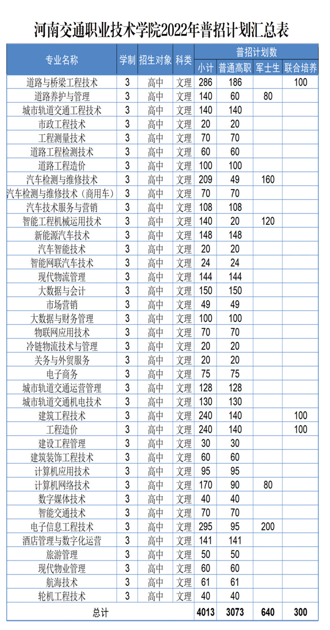 学校秉持“立足交通、面向社会、特色办学、质量立校”的办学定位,紧密对接公路、水路、物流、轨道等交通运输方式开设专业38个,构建了道路桥梁工程技术、现代物流管理、智能交通技术、建筑工程技术、新能源汽车技术等5个重点专业群,形成了以国家级骨干专业为龙头、省部级示范专业为重点、校级特色专业为支撑的专业体系,毕业生就业率连续多年保持在96%以上,骨干专业毕业生就业率达到100%。近70年来累计培养了近12万名交通运输专门人才,一大批校友成为交通运输系统的技术专家和各级管理干部,为河南交通运输事业发展提供了强有力的人才支持和智力保障,被誉为“河南交通人才摇篮”。省委省政府、交通运输部和火箭军主要领导先后到学校视察调研,对学校办学取得的成果给予高度评价和充分肯定。