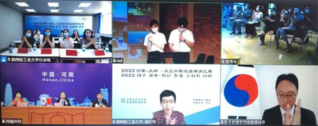 2022年是中韩建交三十周年,也是“中韩文化交流年”。6月24日,由河南省人民政府外事办公室、中国驻釜山总领事馆、河南省教育厅、韩国驻武汉总领事馆、韩国大邱广域市、韩国庆尚北道共同主办,郑州轻工业大学与韩国大邱加图立大学承办的2022河南省—韩国大邱庆北地区汉韩语演讲比赛决赛暨颁奖仪式通过线下、线上相结合的方式成功举办。中国驻釜山总领事馆副总领事涂敬昌、韩国驻武汉总领事馆副总领事柳寅植分别为本次大赛致辞。该校国际合作与交流处负责同志应邀出席了本次比赛。