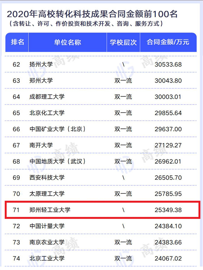6月29日,《中国科技成果转化2021年度报告(高等院校与科研院所篇)》在京发布。《报告》显示,在2020年高等学校以转让、许可、作价投资和技术开发、咨询、服务方式转化科技成果合同金额排行中,郑州轻工业大学以25349.38万元位居全国高校第71位,河南省高校第2位。在2020年高等学校以转让、许可、作价投资三种方式转化科技成果合同金额排行中,该校以7684万元位居全国高校第30位,河南省高校第1位。目前,该校已连续4年获得全国高校科技成果转化合同金额100强。
