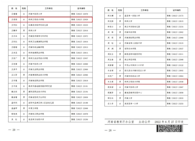 近日,河南省教育厅发布了《关于公布2022年河南省教育厅学术技术带头人入选名单的通知》(教人〔2022〕210号),郑州工程技术学院外国语学院(国际教育学院)王丽丽老师和信息工程学院朱志甫博士荣获“2022年河南省教育厅学术技术带头人”称号。
