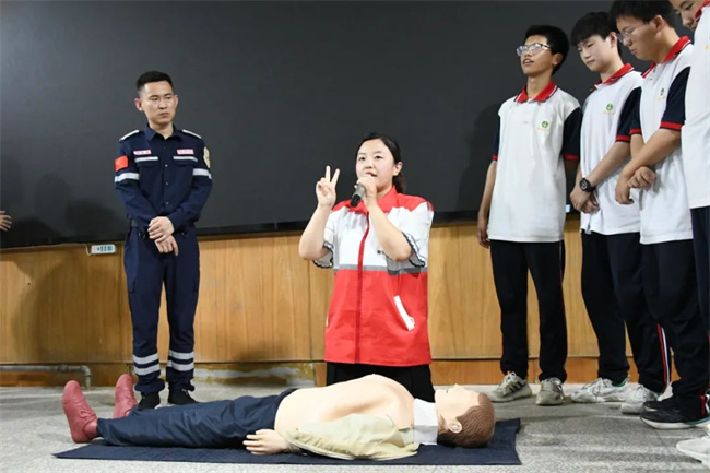 县红十字会应急救护培训讲师王慧丹,用通俗易懂的语言为师生讲解急救知识和技能,重点讲解了心肺复苏的流程和注意事项。通过实际操作演练,用人体模型给大家演示心肺复苏的整体操作流程,如何打开气道、做人工呼吸、定位按压、检查呼吸等环节。学生们争先恐后,都想体验下救助过程,县红十字会应急救护培训师王慧丹耐心讲解,师生们仔细聆听,不断巩固操作要领,通过心肺复苏实操演示,真正掌握了正确的急救方法,做好校园意外伤害和突发事件的应急处理,助力平安校园建设。并指导学生们进行现场演练,在有限的时间内向全校师生有效普及急救技能,收到良好的培训效果。