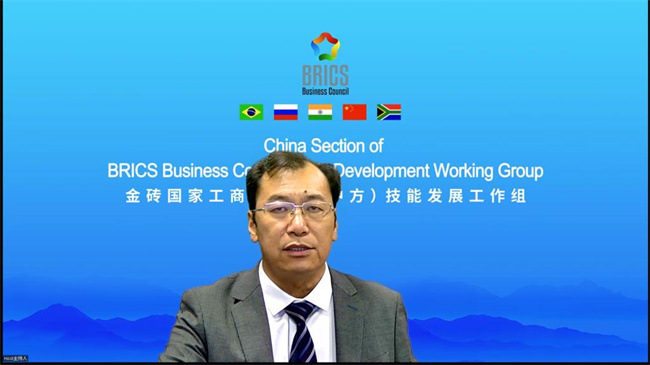 金砖国家工商理事会中方技能组主席、一带一路暨金砖国家技能发展国际联盟理事长、金砖国家技能发展与技术创新大赛组委会执委会主席刘振英讲话