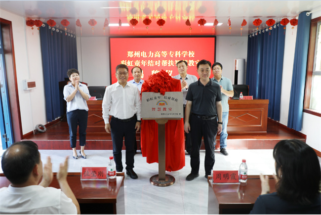 最后,伊川县县委常委、统战部长常光磊和学校党委书记杨义波共同为“郑州电专彩虹童年结对帮扶智慧教室”揭牌。葛寨镇镇长张少刚和学校党委副书记、副校长宗万伟进行省直文明单位“四送一助力”结对帮创签约。