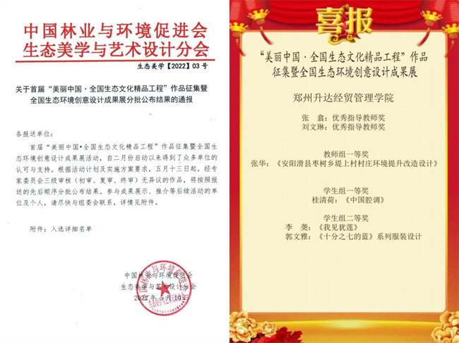 近日,在首届“美丽中国·全国生态文化精品工程”作品征集暨全国生态环境创意设计成果展活动中,经专家委员会审核,郑州升达经贸管理学院艺术学院教师张华获得教师组一等奖,张翕、刘文琳获得优秀指导教师奖;桂清荷获得学生组一等奖,李䶮、郭文雅分别获得学生组二等奖。