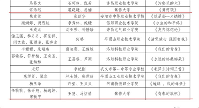 近日,河南省教育厅举办第四届中华经典诵写讲大赛“诵读中国”经典诵读大赛。焦作大学人文学院学生作品《黄河颂》(常浩然)、《青春的旗帜》(任萌萌 张开翔 杨逸婷 宋新宇)分别获得职业教育学生组一等奖;人文学院教师作品《中国的十月》(扈晓婕)获得教师组一等奖;扈晓婕、姜楠、王慧、马恬婧老师获得最佳指导教师称号。