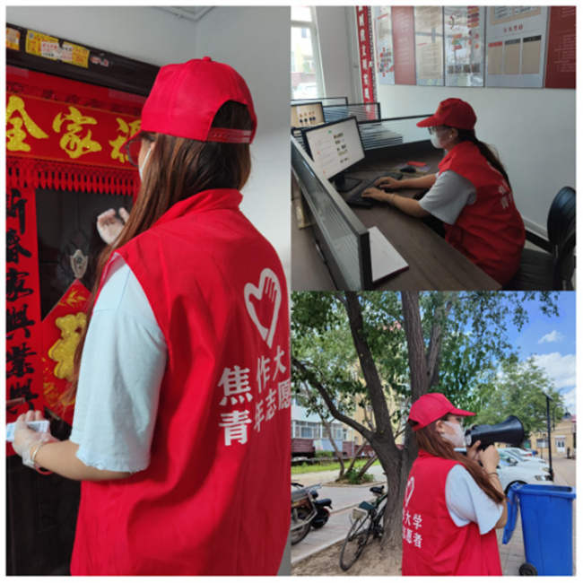 信息工程学院21级软件技术一班张斯诺返乡后第一时间投入到内蒙古赤峰市元宝山区平庄镇的疫情防控工作中,按照疫情防控常态化的要求,用实际行动为打赢疫情防控阻击战贡献志愿力量。作为一名青年志愿者,她始终把志愿者精神牢记在心,在志愿活动中认真负责,尽力服务,向社会展现出焦作大学青年志愿者的风采。“此次社会实践活动让我感触很多,真正理解了‘从群众中来,到群众中去’的内在涵义,认识到只有把个人的命运同社会、同国家的命运联系起来,才是青年成长的正确之路。”她说道。