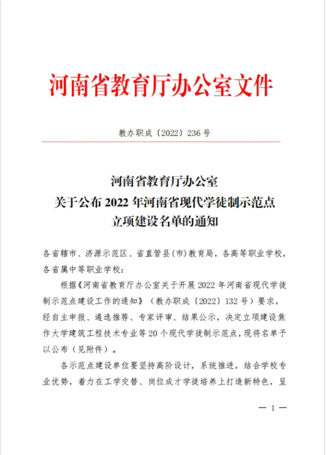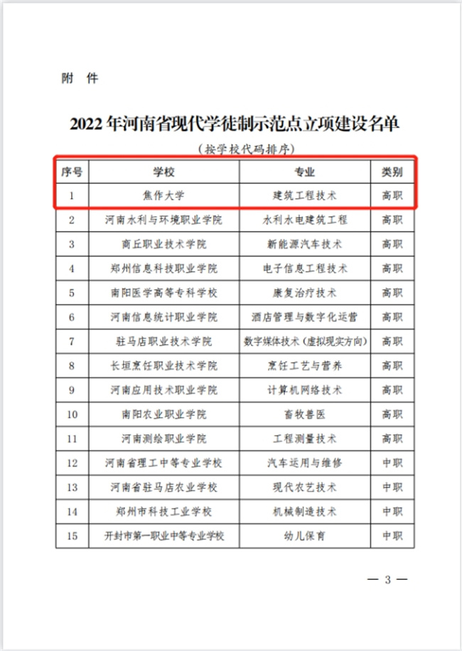 近日,河南省教育厅发布《关于公布2022年河南省现代学徒制示范点立项建设名单的通知》(教办职成〔2022〕236号),焦作大学土木建筑工程学院建筑工程技术专业被认定为河南省现代学徒制示范点立项建设项目。