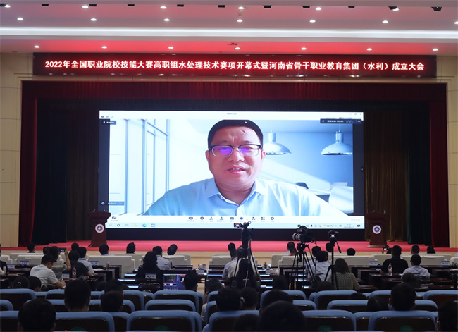 8月13日上午,2022年全国职业院校技能大赛水处理技术赛项开幕式以线上线下相结合的形式在黄河水利职业技术学院学生活动中心举办。教育部职业教育与成人教育司职业院校发展处处长任占营,中国水利教育协会会长张明俊,河南省教育厅副厅长陈垠亭,河南省水利厅二级巡视员傅华,开封市人民政府副市长刘震,该校党委书记、赛区组委会副主任委员周保平,校长胡昊等出席开幕式。来自全国27个省、自治区、直辖市的50支参赛队的领队、参赛选手和指导教师,以及水处理技术赛项专家组、裁判组、监督组、仲裁组的专家,合作企业代表和该校师生代表300余人参加开幕式。开幕式由胡昊主持。