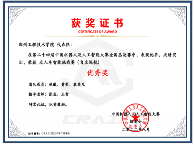 近日,第二十四届中国机器人及人工智能大赛全国总决赛获奖名单出炉,郑州工程技术学信息工程学院物联网工程系师生再获佳绩,物联网工程系学生阳琴、黄嘉悦、刘承承获无人车智能挑战赛国家二等奖,于自豪、高伟杰、李赞、赵曦、黄莹、袁奕凡等同学获无人车智能挑战赛优秀奖。