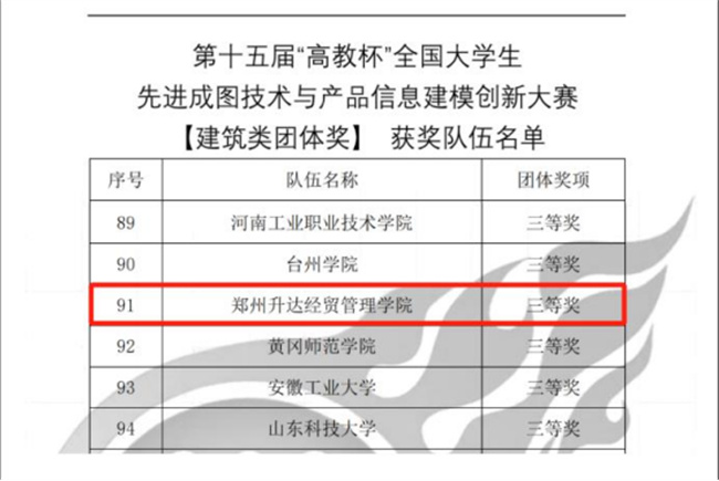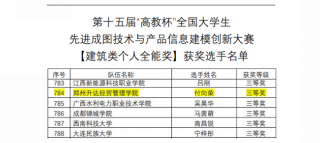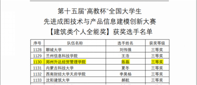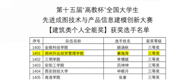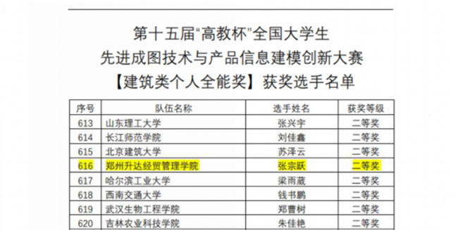 郑州升达经贸管理学院建工学院代表队在第十五届“高教杯”全国大学生先进成图技术与产品信息建模创新大赛全国总决赛中六人居家参赛,其中张宗跃、付向荣、寿业达、陈磊、秦海萍荣获建筑类团体三等奖;张宗跃荣获个人全能二等奖,付向荣、 寿业达、陈磊、秦海萍荣获个人全能三等奖。 BIM创新应用类张宗跃、付向荣、王亚帅、陈磊、秦海萍获得建筑类团队三等奖。