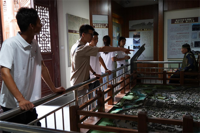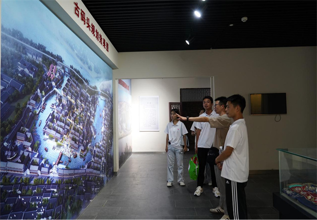 图为实践团成员在古镇沙盘模型前观摩,古会馆、古城墙、古城楼相映成辉,犹如一本厚重的历史古书,一页一页记录着中华文明史的发展,展现着时代的变迁。王宛玲 摄