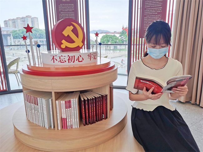图为实践团成员在林村党史学习主题馆二楼党史学习室阅览党史、村史图书。