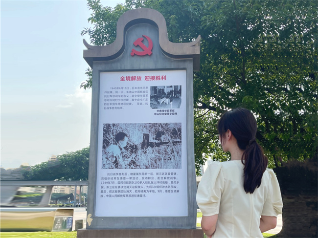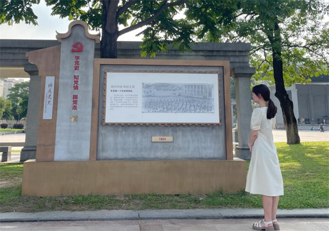 图为实践团成员瞻仰了林村广场的党建雕塑,了解了中国共产党在广东东莞地区从无到有、由弱到强、不断发展壮大的历程。