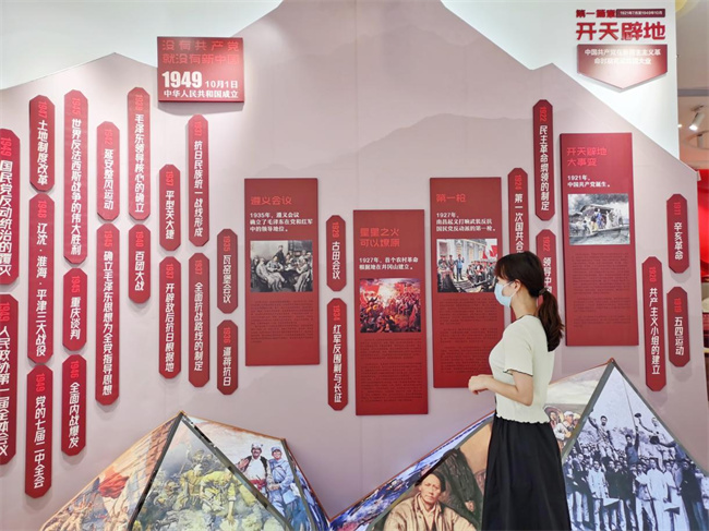 图为实践团成员通过展厅丰富详实的文字、图片、视频及实物介绍,重温中国共产党近百年来波澜壮阔的光辉岁月。