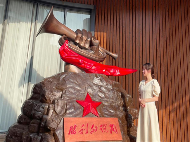 图为实践团成员在“胜利的号角”模型前观摩。王心雨 供图