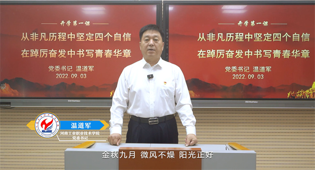 为贯彻落实好河南省委教育工委、省教育厅关于做好2022年秋季“开学第一课”相关工作要求,利用重要时间节点,做好学生思想政治教育,9月3日,河南工业职业技术学院2万余名师生在教室、实验实训室、宿舍等地,通过线下集体观看、云端直播收看等形式,同上秋季“开学第一课”。