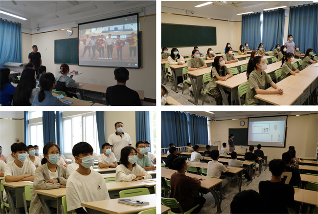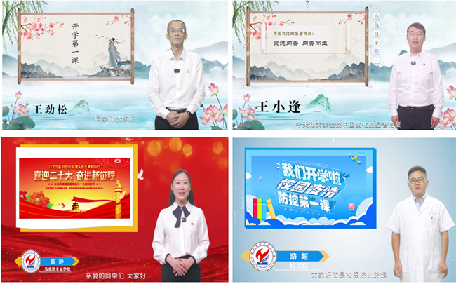 学校基础科学教学部王劲松主任通过阐释何谓大学、何谓大学之道、中国传统文学的基本特征、文学的积极作用,激发学生学习中国传统文学的兴趣,教育引导学生坚定文化自信,增强民族自豪感和认同感,进而扎根诗书、向上生长、崇德向善、向美而生。基础科学教学部王小逢老师围绕中华文化“崇德向善向美而生”的显著特征,阐述赓续中华文明的重要意义,教育引导当代大学生继承、发扬优秀传统文化中的情怀、使命、担当。马克思学院郭静老师引带领学生了解二十大对党和国家的重要意义,引导学生从百年党史中汲取青春奋进力量,努力做强国新征程上的有为青年,鼓舞和激励学生以良好的精神面貌开启2022年秋季学期新征程,以奋进姿态喜迎党的二十大胜利召开。校医院路超医生围绕新冠肺炎疫情防控、健康科普、个人防护等方面做好教育引导,帮助广大学生增强防护意识、掌握防护技能,维护师生生命安全和身心健康。