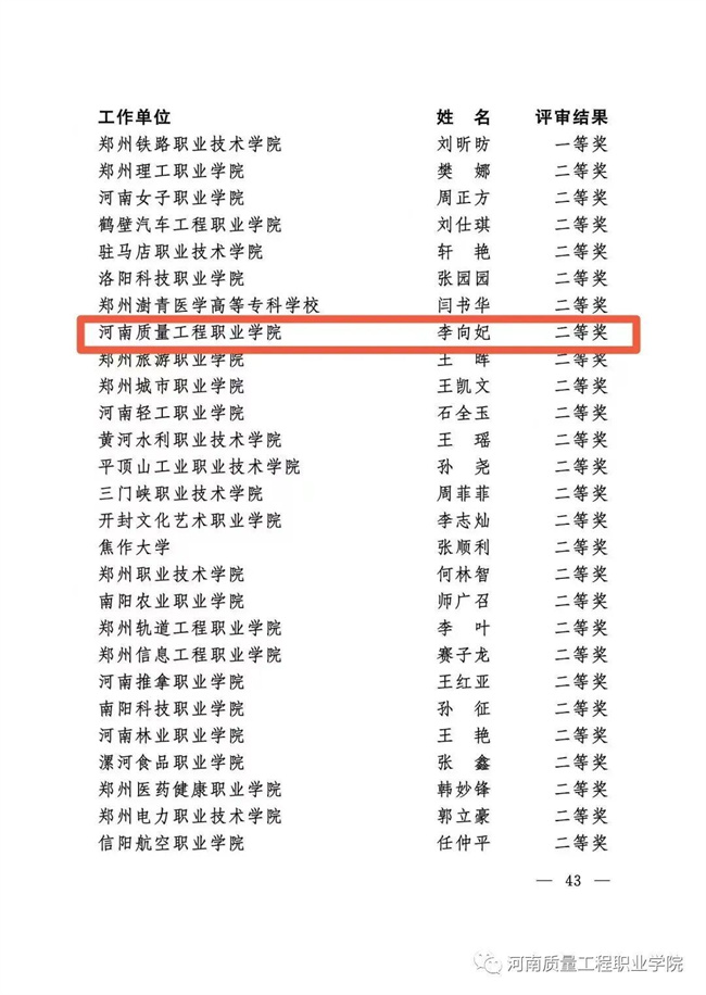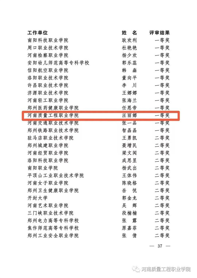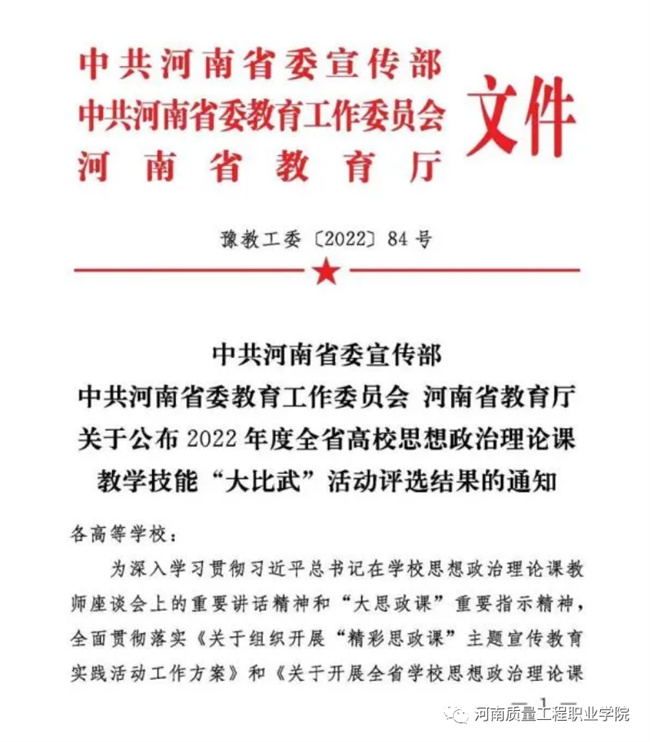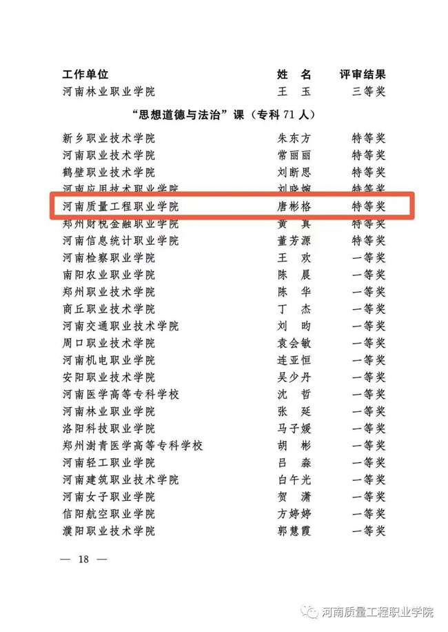 近日,中共河南省委宣传部、中共河南省委教育工作委员会、省教育厅下发了《关于公布2022年度全省高校思想政治理论课教学技能“大比武”活动评选结果的通知》,对获奖教师及单位进行表彰,河南质量工程职业学院思政部教师唐彬格、汪丽娜、李向妃以精心的教学设计、典型的案例分析、多样的教学形式在比赛中取得了优异的成绩,最终分别获得特等奖、一等奖、二等奖,为河南质量工程职业学院教师在省级思想政治理论课教学技能竞赛开了新局。(河南质量工程职业学院供稿)