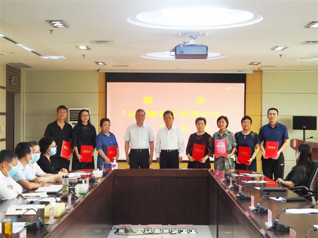 座谈会上,苏炜副书记宣读了《关于对2022年从事教育工作满30年的教职工进行表彰的通知》;周春辉书记、卢奎校长向学校从事教育工作满30年教职工颁发了荣誉证书。