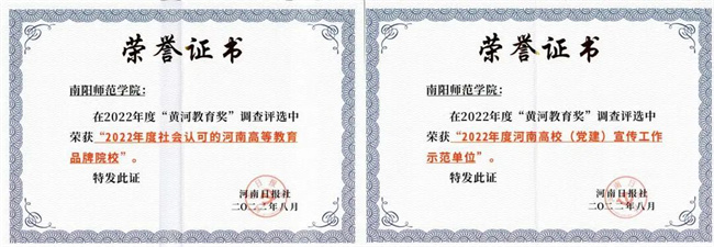 近日,由河南日报社主办的第十三届“黄河教育论坛”暨“2022年度黄河教育奖”评选活动结果揭晓,南阳师范学院获评“2022年度社会认可的河南高等教育品牌院校”和“2022年度河南高校(党建)宣传工作示范单位”。