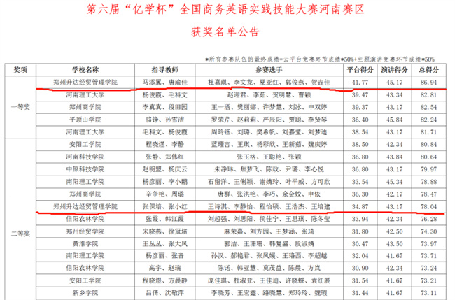 近日,第六届河南省“亿学杯”商务英语实践技能大赛正式落下帷幕,郑州升达经贸管理学院外国语学院商务英语教研室唐瑜佳、马添翼、张保培、张小红四位教师带队参赛。经过全省50支参赛队伍的激烈角逐,郑州升达经贸管理学院由2019级商务英语本科班杜嘉琪、李文龙、夏亚红、郭俊燕、贺垚佳组成的代表队以总成绩第一名的好成绩获得此次商务英语实践技能大赛一等奖。