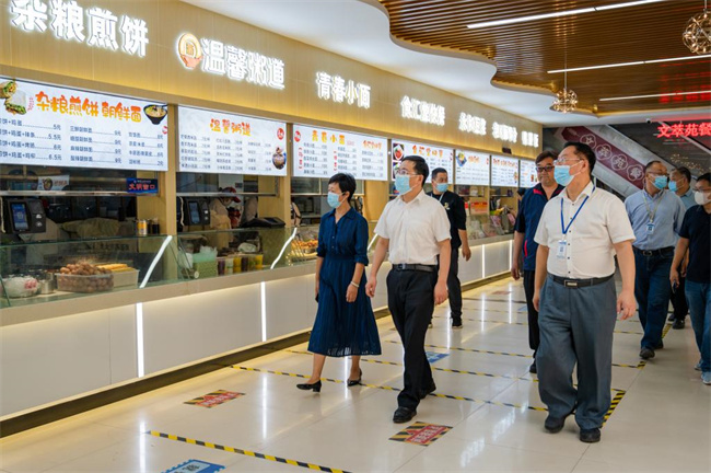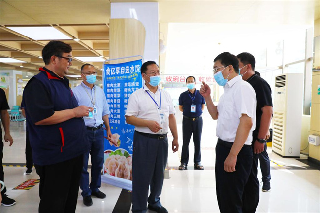 调研组一行深入学校西大门、茗羽餐厅、核酸检测点等处,实地查看扫码测温、入校登记、按序就餐、感应洗手、检测点设置等工作。调研过程中,校领导从校园管控、重点人健康管理、错时错峰上课就餐等方面详细汇报了学校疫情防控工作情况。调研组对我校秋季开学疫情防控各项工作给予了充分肯定,并对相关工作提出了建设性指导意见。