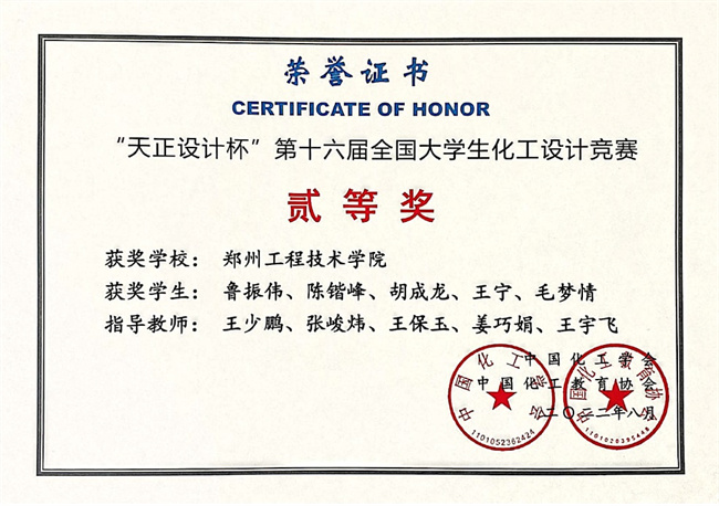 近日,第十六届全国大学生化工设计竞赛组委会正式公布了2022年比赛结果,郑州工程技术学院化工食品学院化学工程与工艺专业学子鲁振伟、陈锴峰、孟砥、王宁和毛梦情等学生组成的“制醇联盟”队,经过单项打分、线上汇报和线上答辩,从华中赛区脱颖而出,荣获国赛二等奖。