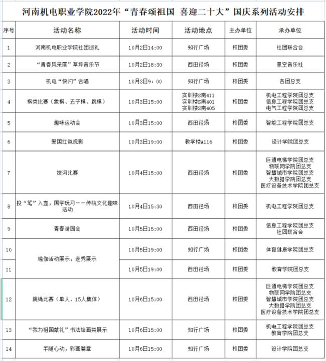 金秋十月,繁花似锦;国逢盛世,普天同庆。在祖国母亲73岁华诞和喜迎党的二十大胜利召开之际,河南机电职业学院举办了各式各样的校园活动丰富了师生们的假期生活。