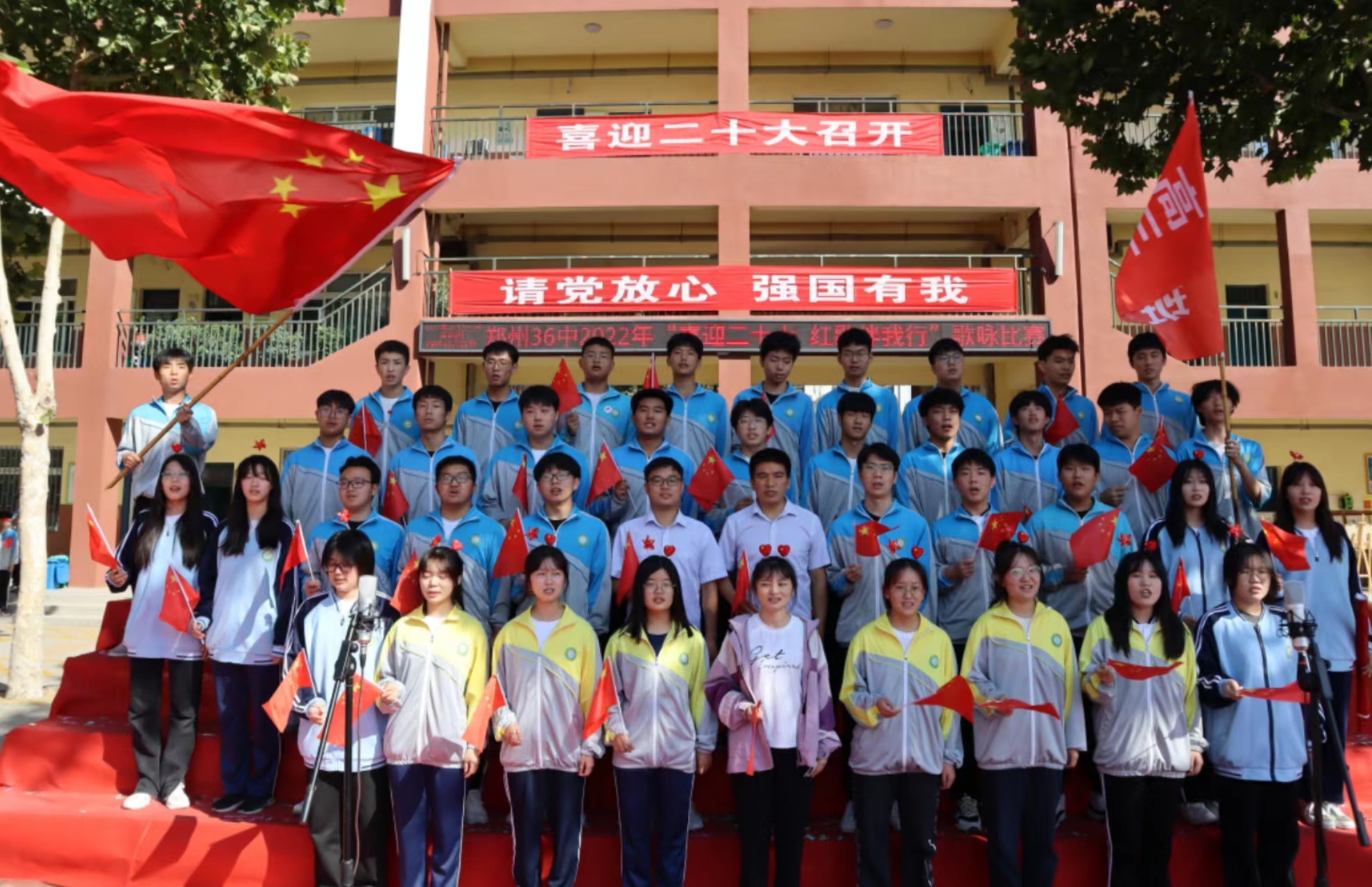 为热烈庆祝中华人民共和国成立73周年,2022年9月29日上午,郑州市第三十六中学举行了“喜迎二十大红歌伴我行”歌咏比赛。活动在庄严肃穆的国歌声中拉开序幕。首先,全体师生齐唱《我和我的祖国》。舞台上、操场上、教学楼上,师生们类同挥舞红旗,深情歌唱,为祖国母亲的生日献上贺礼,展示出郑州36中师生团结心、创新奋进的良好精神风貌。