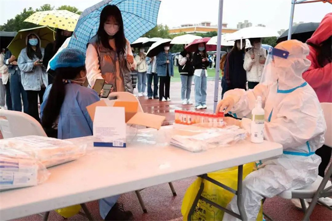 学校在48小时周期内,组织全校免费核酸检测。核酸检测现场辅导员分工明确,高效协作,负责班级的调度。现场志愿者秩序维护有序、路线指引认真细致,尽管一直下雨,同学们秩序井然,整个核酸全程安全高效。