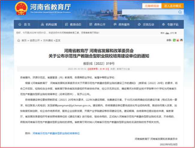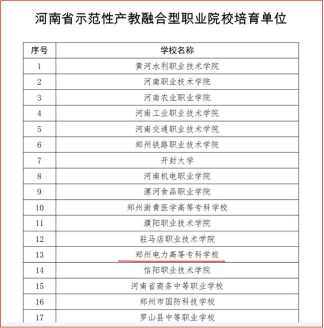近日,根据《河南省教育厅河南省发展和改革委员会关于开展示范性产教融合型职业院校建设工作的通知》(教职成〔2022〕20号)的要求,省教育厅联合省发改委组织专家综合评审,经公示无异议后,确定19个学校为河南省示范性产教融合型职业院校培育单位,郑州电力高等专科学校成功入选,为14所获批示范性产教融合型高职院校培育单位之一。