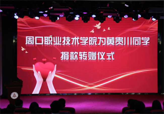 11月4日上午,周口职业技术学院为黄贵川同学捐款转赠仪式在本校学前与艺术教育学院一楼演播厅举行。