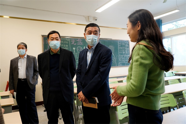 王伟听取了马克思主义学院郭静老师的《思想道德与法治Ⅰ》课,郭静以《坚定信仰信念信任信心》为题,教导学生在学习、实践中,真学真懂真信真用马克思主义,在生活中要读原著、学原文、悟原理。王伟详细记录了课堂教学要点,查看教学文件,对郭静的教学态度、教学内容、教学方法以及教学效果给予肯定。他指出,广大思政课教师要认真研究设计思政课教学内容,创新教学方式方法,增强教学的吸引力、感染力,不断提升思政课教学质量和水平。