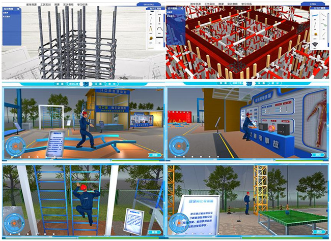 “四元融通”联合开发理虚实一体化教学资源,以虚助实,突破难点。利用BIM技术虚实结合的特点,联合河南建协、中建七局、中铁二十局、河南天工、廊坊中科、广州中望、北京广联达、西安三好等行业、企业、证书、竞赛的相关方,开发岗课赛证“四元融通”特色的虚拟仿真教学资源。对接BIM基础应用、专项应用、综合管理等岗位群,基于真实工程项目、典型安全事故、复杂工序,开发《基础工程施工》等理虚实一体的模块化课程18门、方舱医院等工程项目仿真33个、洞口坠落等安全事故仿真63个、异形屋面等复杂工序仿真782个,融入免共振微扰动沉桩等“建筑五新”85项,有效解决建筑实训高风险、难再现、高消耗等痛点。同时,开发杨靖宇革命纪念馆等红色教育仿真资源34个、时光宝盒国宝文物等素质教育仿真资源15个、云上邹庄美丽乡村等课程思政仿真资源45个,有效解决公共基础课教学的应用场景难实施、难观摩、高投入等痛点。应用BIM技术以虚助实,有景、有趣、有效、有用,突破理实一体化的难点,形成了理虚实一体的模块化、系统化虚拟仿真实训体系。