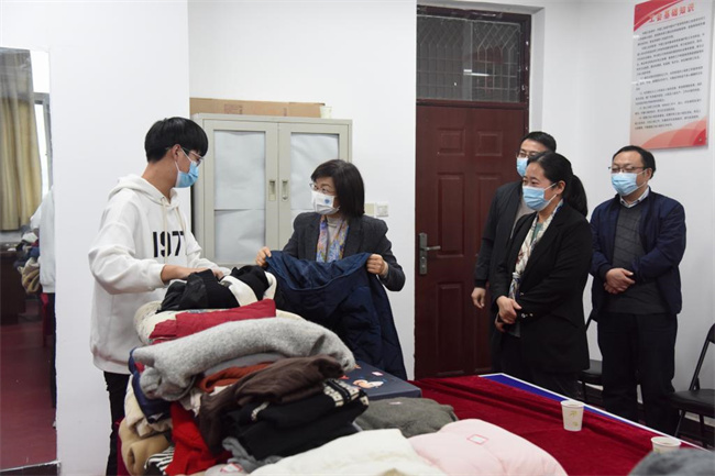 在电商物流学院和智慧健康学院捐赠现场,李桂贞为学生捐赠了棉衣、棉被等御寒物品,并亲自帮助学生挑选、试穿,窗外虽寒气袭人,但现场暖意融融。李桂贞鼓励同学们要坚定战胜疫情的信心,敢于在困境中成长,在激流中奋进,既要遵守疫情防控要求,又要做好自身御寒保暖,要充分利用好这一特殊时期刻苦学习、增长才干,努力成长为有理想、有抱负、有担当的时代有为青年。