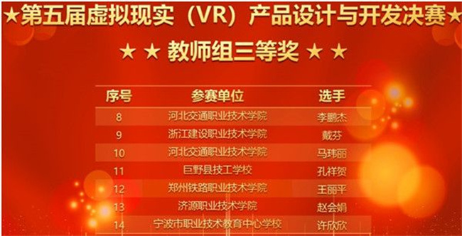 2022“一带一路”暨金砖国家技能发展与技术创新大赛—第五届虚拟现实(VR)产品设计与开发决赛,于11月8日至11日在四川化工职业技术学院以线上线下相结合的方式举行。济源职业技术学院教师赵会娟荣获第五届虚拟现实(VR)产品设计与开发赛项教师组三等奖。