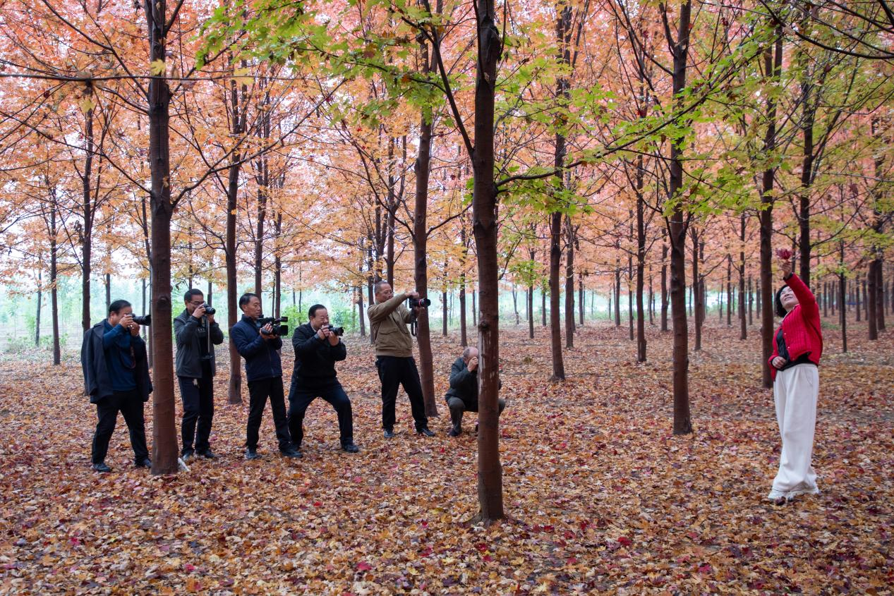 采风过程中,创作者们沉浸式感受着故道秋韵的独特魅力。年近六旬的摄影爱好者蒋正杰手持相机,连续拍摄了数十张枫叶特写。他笑着说:“申甘林带的秋,于我而言就像一本读不尽的书,年年都想翻开再品。原以为熟悉了它的轮廓,可每一次踏入,总能在转角处遇见新的美好。今年尤其不一样,整个秋天雨水丰沛,枫叶格外‘饱满’,揉进整个秋日的暖阳;那抹艳色也更显灵动,风一吹,满林红叶似跳动的火焰,连空气里都飘着甜甜的秋意!”